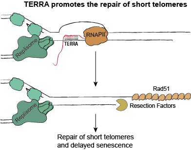 We have recently shown that the non-coding RNA, TERRA, is important for controlling telomere length during the senescence process. TERRA forms RNA-DNA hybrids (R-loops) at short telomeres and promotes telomere repair (see diagram on right). In this manner, TERRA prevents cells from entering senescence too quickly. We are trying to understand, in complete detail, the molecular regulation of TERRA and R-loops at telomeres. We are performing these experiments in yeast as the regulation of TERRA and R-loops is similar to what occurs in human cells. Our long-term goal is to be able to manipulate TERRA levels to control rates of senescence. This may have important implications for telomere biology disorders, where shortened telomeres result in premature aging phenotypes.