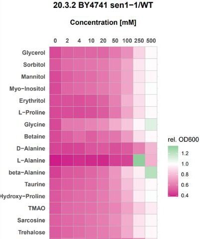 Recently, it has been demonstrated that the osmolyte, taurine, can extend lifespan in a wide range of organisms when administered as a supplement. Furthermore, many age-related ailments were improved when increasing amounts of Taurine were given to mice. Despite these encouraging results, it is not fully understood how taurine works on the molecular level to extend both lifespan and healthspan. We used yeast as a model organism to interrogate the effects of taurine on the 5 primary molecular hallmarks of aging. Taurine did not affect telomere length, DNA repair, autophagy regulation or epigenetic gene regulation, however it did improve proteostasis. We have shown that taurine maintains proteins in a folded and functional state when they are challenged with stresses, such as heat, age and mutation. We are investigating the possibility of using taurine, and other osmolytes, in combination to protect against aging and other diseases associated with protein misfolding. We have modelled Senataxin mutations that cause ALS4 and AOA2 in humans onto the yeast Sen1 protein and shown that taurine and other osmolytes can rescue the associated phenotypes (see figure on right).