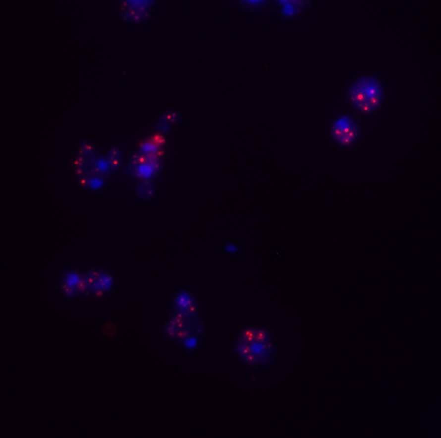 As we age, multiple intra-cellular functions are compromised. Interestingly, it has recently been shown that the speed of transcription increases in older, compared to younger, organisms. The alteration of transcription rates has multiple knock-on effects including increased torsional stress, altered transcription termination usage and the increased probability of an unscheduled interaction between the transcription machinery and the DNA replication machinery; a so called transcription-replication conflict (TRC). TRCs also lead to the formation of RNA-DNA hybrids and R-loops (red foci in figure on right). Hence, it is important to understand how TRCs are regulated in both normal and aged cells so that this type of genomic stress can be managed. We have shown that when TRCs accumulate, the RNase H1 enzyme gets activated and its protein levels increase. RNase H1 is an enzyme that is devoted to the removal of RNA-DNA hybrids and we are currently trying to understand how its regulation is controlled.